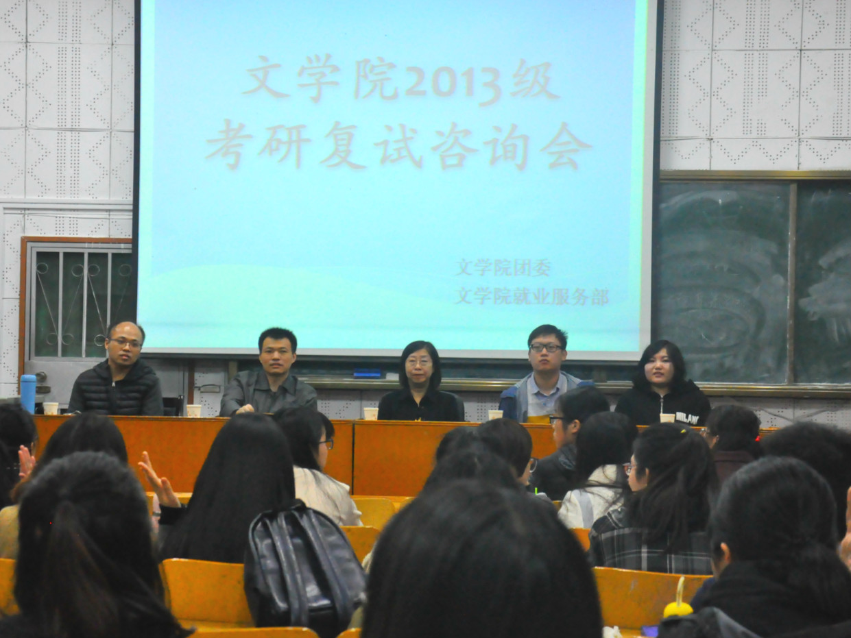 咨询会上,秦海燕分析了应用语言学专业的特点,总结了复试注意事项;王斌博士从多个重点大学的学术传统和特色出发,剖析了不同学校同一专业复试可能存在的我问题,朱献贞副教授就有关现当代文学专业复试注意事项也谈了自己的看法;两位专业硕士研究生也结合自身的学习经验做了发言。