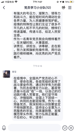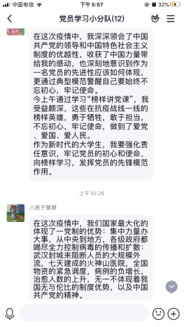 随后,党员们就党课内容在小组内谈收获,谈体会,谈打算。他们深刻地领悟到:党的领导,是我们战胜一切艰难险阻的根本保证。在今后的学习生活中,我们要牢记榜样力量,学习榜样精神,不忘初心,乐于奋斗。最后党员们共同对抗疫先锋表示感谢,感谢他们白衣执甲,勇敢逆行;不惧风雨,日夜坚守。