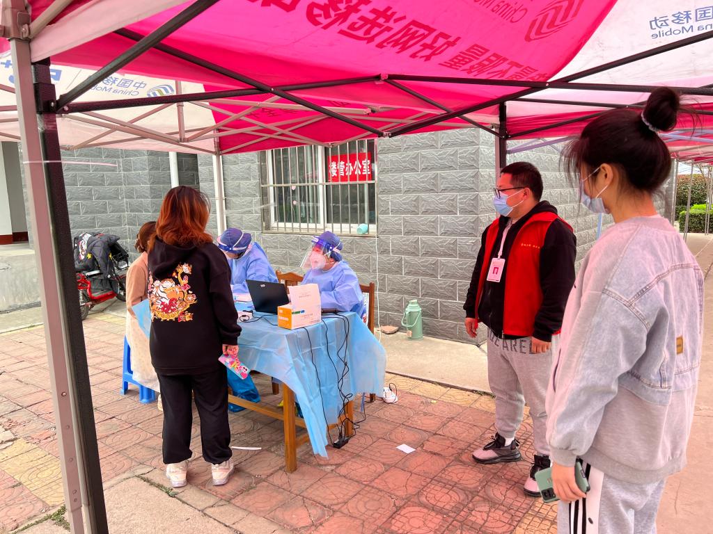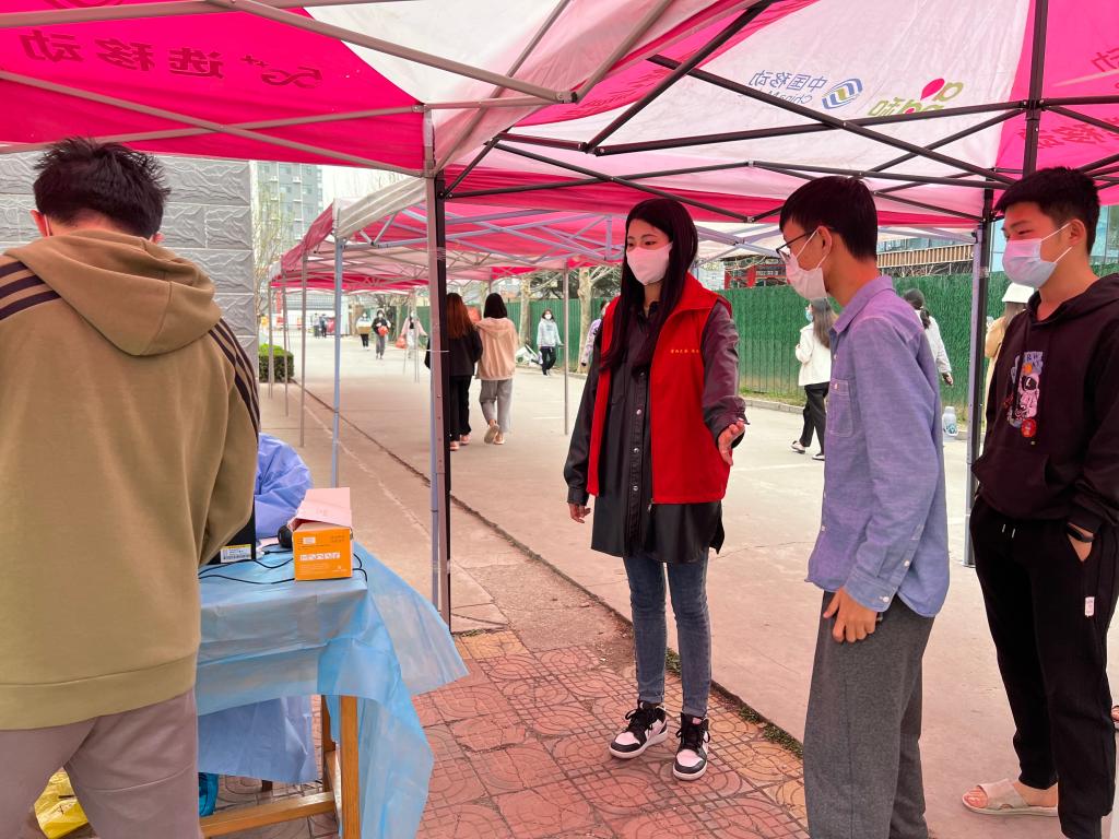 bet365 本科生党支部进园区,支部委员高原老师、刘怀峰老师在裕盛苑核酸检测现场维持秩序,叮嘱参检学生保持一米间隔。