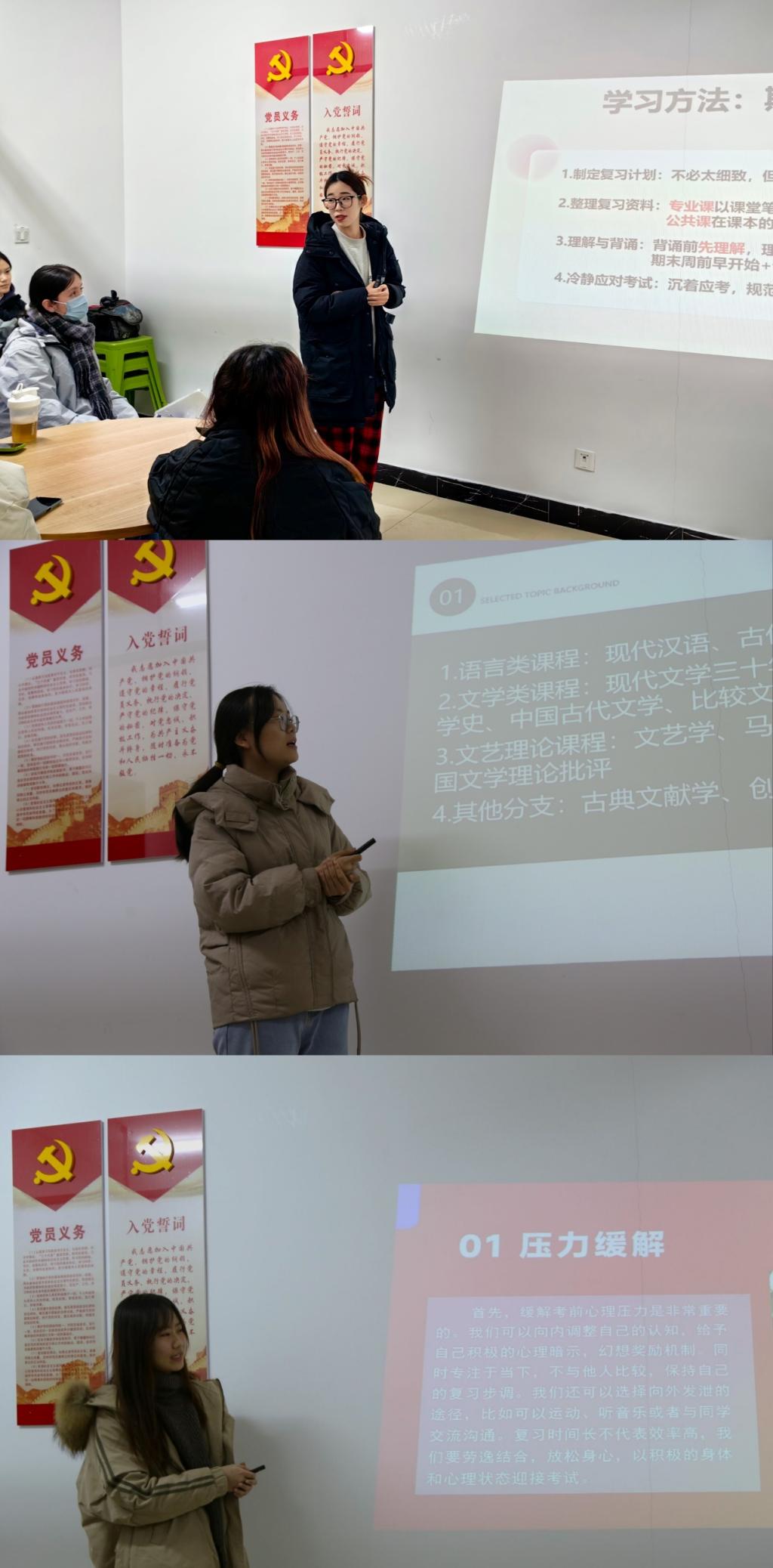 座谈会中,学生党员结合自身经历,围绕学习方法、备考计划、复习资料等分享成长经验。其中,王心怡、石梦丹针对日常学习、科学备考等问题进行经验分享。她们建议少数民族学生要在日常学习中稳扎稳打,制定好科学的复习计划,冷静沉着应考。王钧禾为少数民族学生如何缓解考前心理压力提供借鉴,并就实习心得感悟进行分享。她指出大家要立足当下,扎实学习理论知识,更好地为未来的发展蓄能。随后,与会学生就学习、生活、工作等问题开展交流。少数民族学生畅谈个人成长体会与感悟,介绍了各自在学校的学习和生活状况,反映了目前学习生活上存在的困惑。学生党员代表就少数民族学生的问题给予耐心细致的解答。