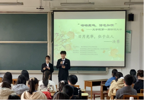 比赛以“日月光华,弘于众人”为主题,分为火眼金睛和主题对垒两个环节,初赛和复赛中脱颖而出的选手组成三个小组进行对抗。在欣赏了由文艺部同学表演的舞蹈之后,各小组根据抽签顺序回答问题,大显身手。在一轮轮紧张的对决中,选手的诗词功底体现得淋漓尽致,各小组为现场观众展现了一场绝佳的诗词盛宴。比赛全程由工作人员担任计分员与计时员,确保比赛公平公正。