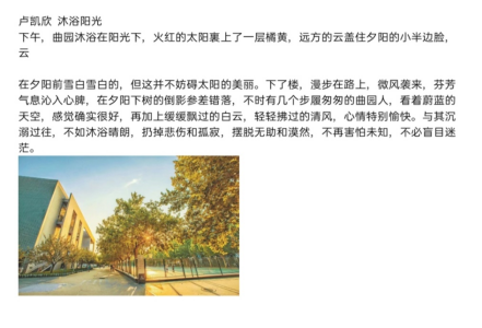 护绿荫里乘凉,纯净心理;阳光下欢笑,健康向阳。本次活动的心理健康宣讲语创意大赛围绕“健康心理”展开,以标语书写的形式沐浴心灵;身边的小确幸摄影比赛围绕身边的暖心瞬间展开,以照片记录的形式体现生活。本次活动秉持公平公正公开的原则在线上征集作品,同学们加入QQ群将作品发给指定人员,在征集结束后进行群内投票,评委评选优秀作品,并进行打分、统计分数。本次活动的心理健康宣讲语创意大赛评选出一等奖一名,二等奖四名,三等奖五名,身边的小确幸摄影比赛评选出一等奖两名,二等奖四名,三等奖四名。至此,心理健康月活动圆满落幕。