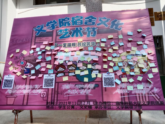 上午9点,启动仪式正式开始。肖黎老师宣布仪式开始,张乾坤老师致开幕词,强调了宿舍生活对大学生学习生活的重要意义,并鼓励同学们积极参与到宿舍文化艺术节活动中。随后,宿卫部成员详细介绍了宿舍文化艺术节的活动,活动包括宿舍Vlog竞赛、安全知识竞赛、舍歌比赛、微电影征集与征文比赛,活动富有趣味,现场欢乐融洽。宿卫部成员与同学们积极互动,就同学们关注的活动内容、评分细则、奖项设置等方面进行详细讲解,同学们也积极配合,展现出同学们对本次宿舍文化艺术节的极高热情。最后,到场同学在便签上写下了对宿舍生活的感受以及对美好生活的期望,由宿卫部把带有美好憧憬和祝福的便签贴到了活动展板上,同学们则回到宿舍进行卫生打扫和宿舍装饰,本次启动仪式画上圆满句号。