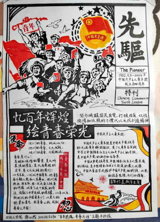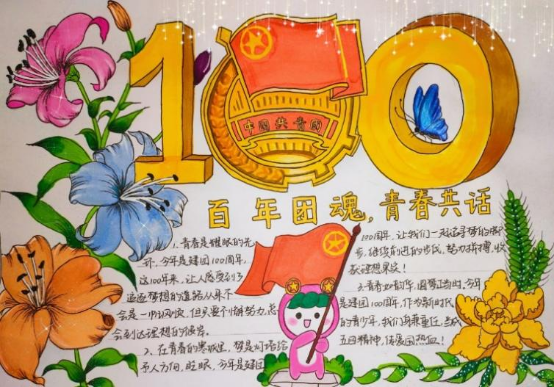 赓续百年凌云志,怀揣梦想再起航。“百年团魂,青春共话”手抄报活动在丰富学生课余生活、锻炼学生动手能力与激发学生想象力的同时,也增强了学生对中国共产主义青年团的认同感和归属感,促使学生不忘初心,牢记使命,坚定理想信念,不负青春韶华。百年前热血青年矢志报国,百年后青年学子将承担新时代赋予的重任,发扬团的荣光,谱写青春华章,续写新时代更辉煌的历史答卷!