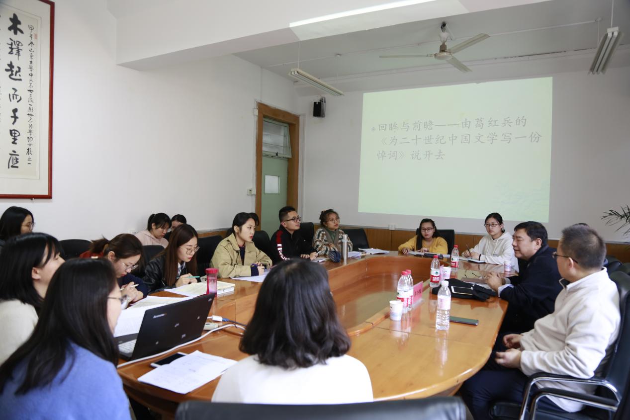 首先,康长福老师指出本次活动的目的:一方面,打破之前本科阶段对于知识的机械接受和对于作家的刻板印象,培养大家的反思与质疑能力;另一方面可以通过对二十世纪文学得与失的认识梳理,更好的展望未来。然后,2019级中国现当代文学专业全体学生就本次活动主题发表了自己的看法。紧接着三位老师分别发表了自己的观点。翟文铖老师一方面针对同学在发言中出现的问题,提出了他对文学语言反常规、陌生化的理解,并指出中国的语言资源基本来自于民间方言和古典文学、翻译作品中的语言。他表示,正是由于对古典文学中语言的忽视,以及普通话的推广,导致了如今汉语资源萎缩的问题。翟老师借此次活动,呼吁研究者们不断加强对中国古典文学和方言的重视。另一方面,他指出了创作中存在的语言问题,强调了语言风格对作家、作品的重要性。李杰俊老师肯定了同学们的努力,告诫同学们要仔细阅读文本,有“批判之批判,反思之反思”的精神。李老师强调,学生需要听一些“刺耳”的声音,从而引发对学科发展史的深层思考,并推荐同学们阅读夏志清先生的《中国现代小说史》。