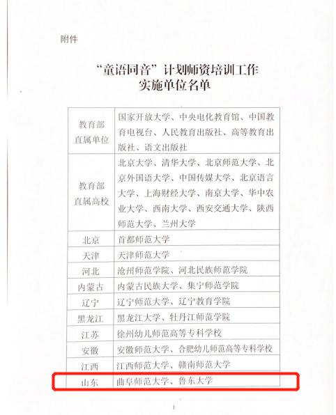日前,教育部语言文字应用管理司公布了“童语同音”计划师资培训工作实施单位遴选结果,我校国家语言文字推广基地入选“童语同音”计划师资培训工作实施单位。山东省入选的单位有bet365 、鲁东大学。
