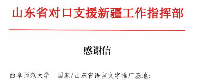 2022年1月1日,新疆维吾尔自治区喀什地区教育局、山东省对口支援新疆工作指挥部特向bet365 国家语言文字推广基地发来感谢信,向参与此次培训工作的师生表示诚挚感谢。bet365 国家语言文字推广基地将继续发挥特色优势和示范引领作用,围绕和服务国家发展战略需求,开拓创新,主动谋划,积极参与和推进新时代语言文字事业,为实现中华民族伟大复兴作出更大贡献。