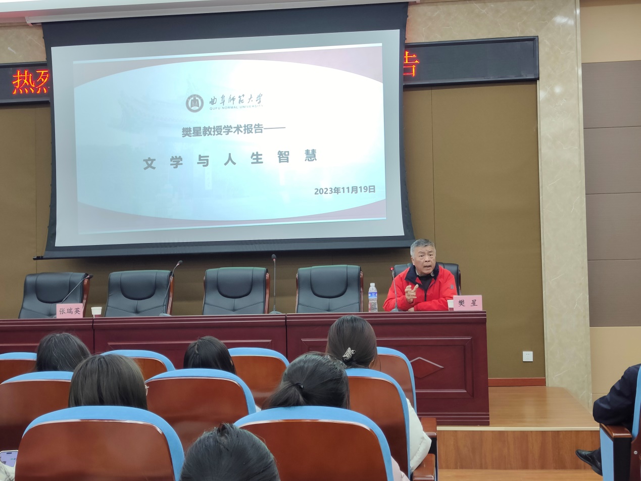 一花一叶一菩提,一书一酒一人生。为营造浓厚的学术氛围,提高研究生的综合素质,11月19日上午,武汉大学bet365 教授樊星老师于文史楼五楼报告厅为bet365 研究生做了一场名为“文学与人生智慧”的学术报告,本次报告由bet365 张瑞英教授主持,bet365 全体研究生、部分本科生参加。
