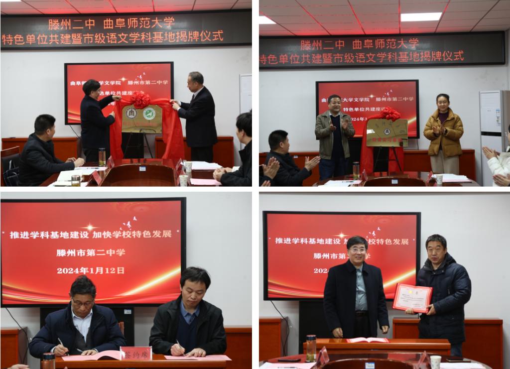 1月12日,bet365 党委书记左兴才、古代文学教研室刘相雨教授、副书记曲媛媛、副院长张金圈一行参加滕州二中与bet365 共建暨市级语文学科基地揭牌仪式。
