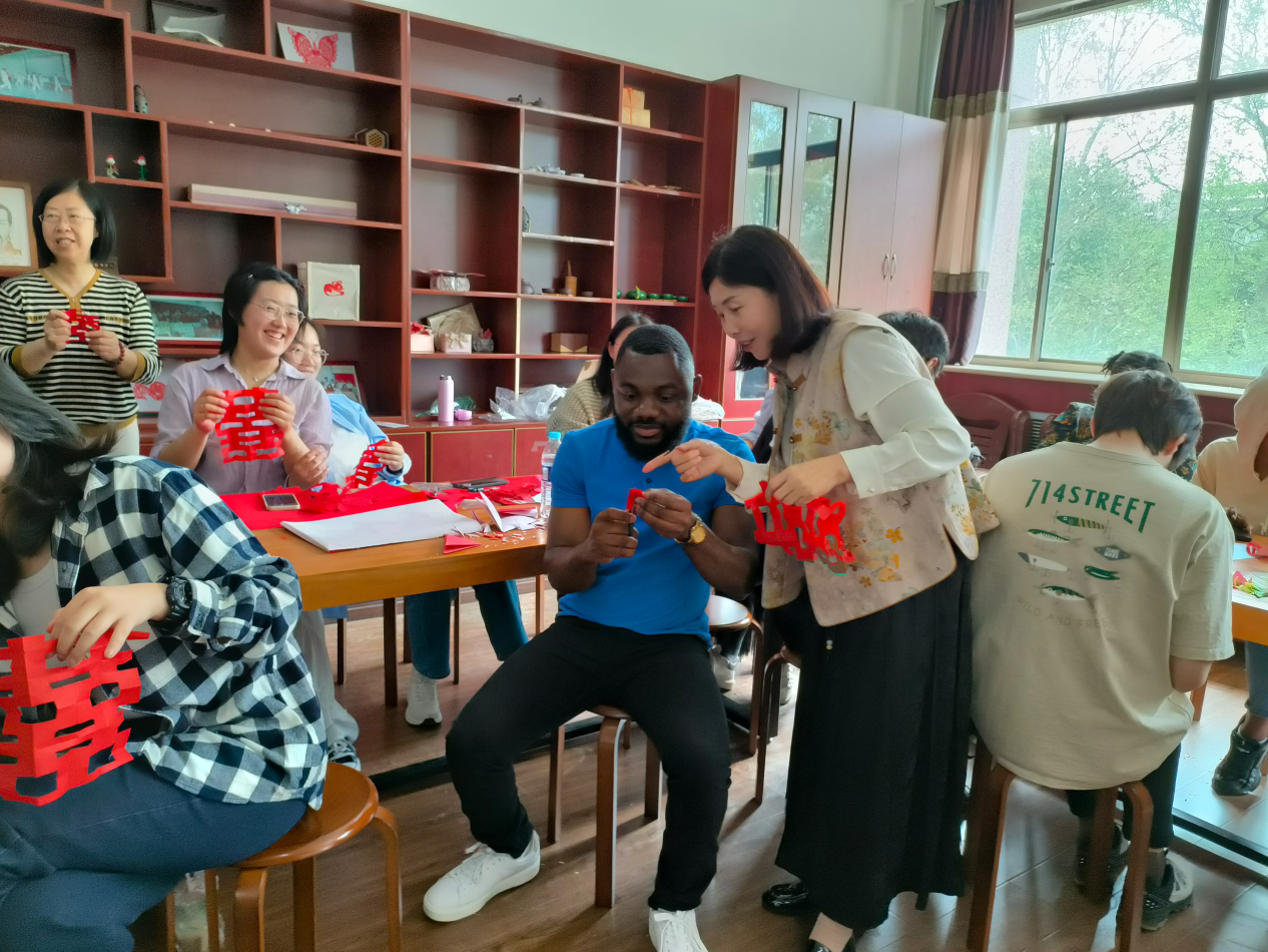 在课堂上,不仅中国学生,还有来自赤道几内亚、苏丹、肯尼亚和越南的外国留学生,他们都对近距离地了解和学习剪纸表现出强烈的兴趣和热情。为让同学们更直观地感受到剪纸的魅力,常老师展示了她和她的学生们的作品,团花富贵吉祥,刻纸玲珑剔透,彩色剪纸栩栩如生。一幅幅剪纸,蕴含着书法与图画融合的魅力;,一张张相框,锁不住剪纸跳跃的风华;一把把团扇,交融着剪纸的精致与典雅。“一把剪刀,一方红纸,纸转,手不转。千剪不断,纸纸相连”,常老师耐心而细致地向同学们传授如何剪纸。大家在常老师的精心指导下,不仅剪出了各具特色的团花图案,而且学会了剪“喜”字和“福”字。在常老师授课的时候,来自赤道几内亚的留学生边听边模仿,然后再单独练习剪团花,剪“福”字;来自越南的留学生,每剪出一个作品,就兴奋地让同伴拍照,开心地与自己的作品留念;来自苏丹和肯尼亚的留学生,向周围同学请教从哪里剪,一刀刀剪出满意的图案。
