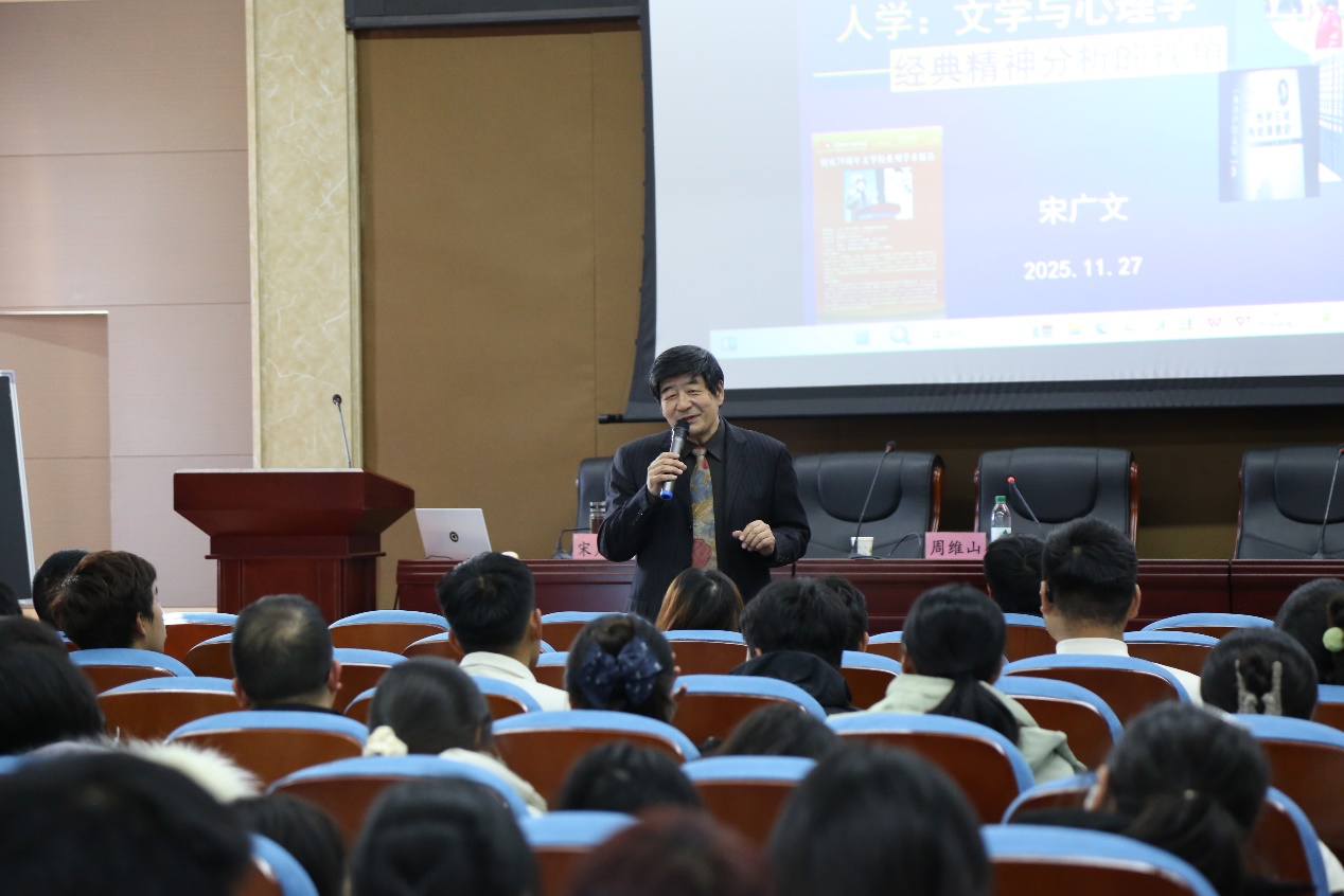 为深入探讨经典精神分析的基本理论框架,从而拓展文学阐释的视角,深化对文本中人物动机、行为逻辑与情感结构的理解。11月27日,华南理工大学心理学教授、心理测评与应用心理学研究所所长宋广文应邀于明德楼509学术报告厅为bet365 师生做了一场题为《人学:文学与心理学——经典精神分析的视角》的学术报告。bet365 党委书记左兴才、部分老师和百余名本硕博学生参加报告会,报告由bet365 周维山教授主持。